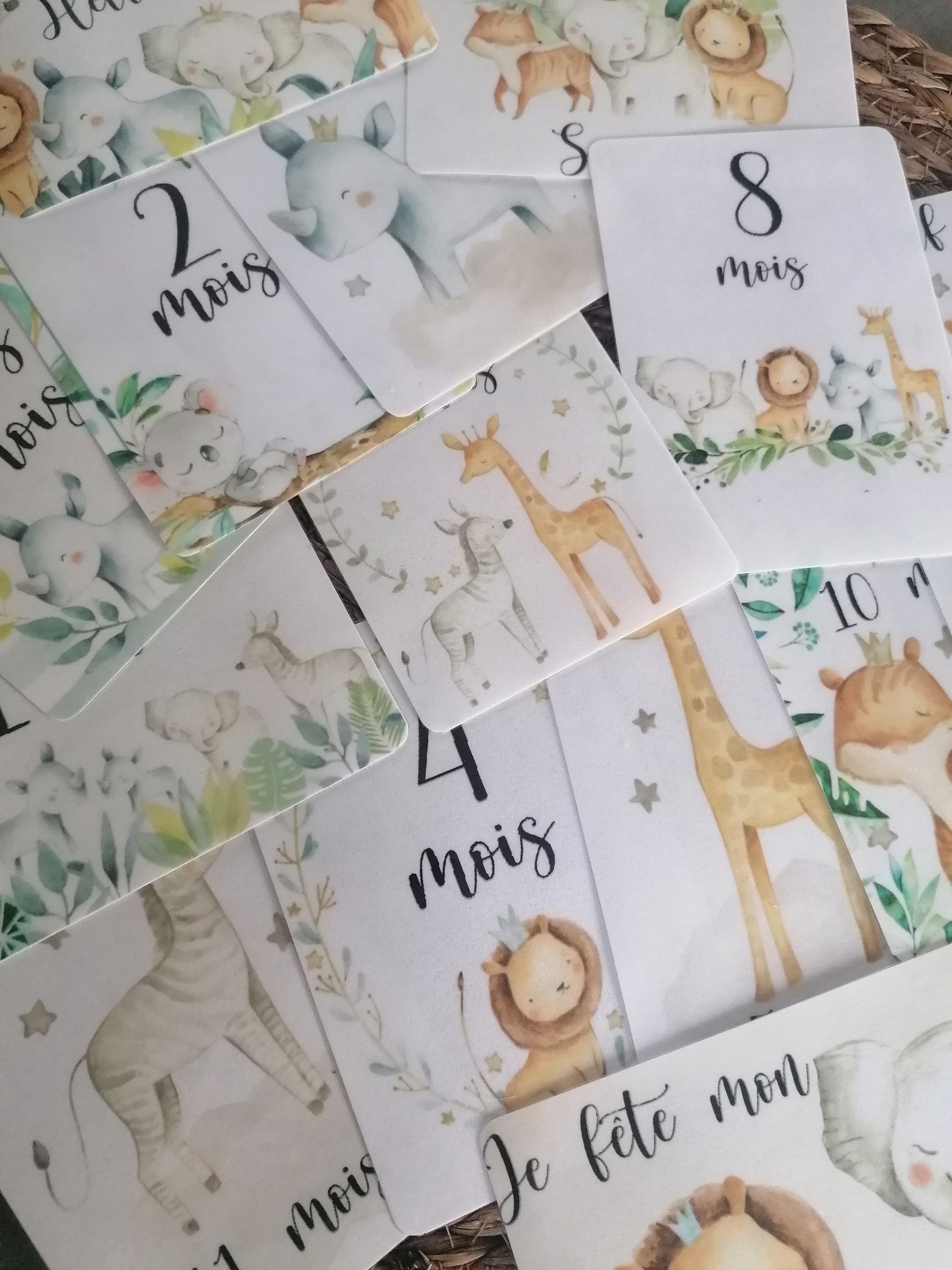 Capturer les précieux premiers moments de vie de votre bébé avec ce joli lot de 14 cartes étapes « Safari / jungle ».